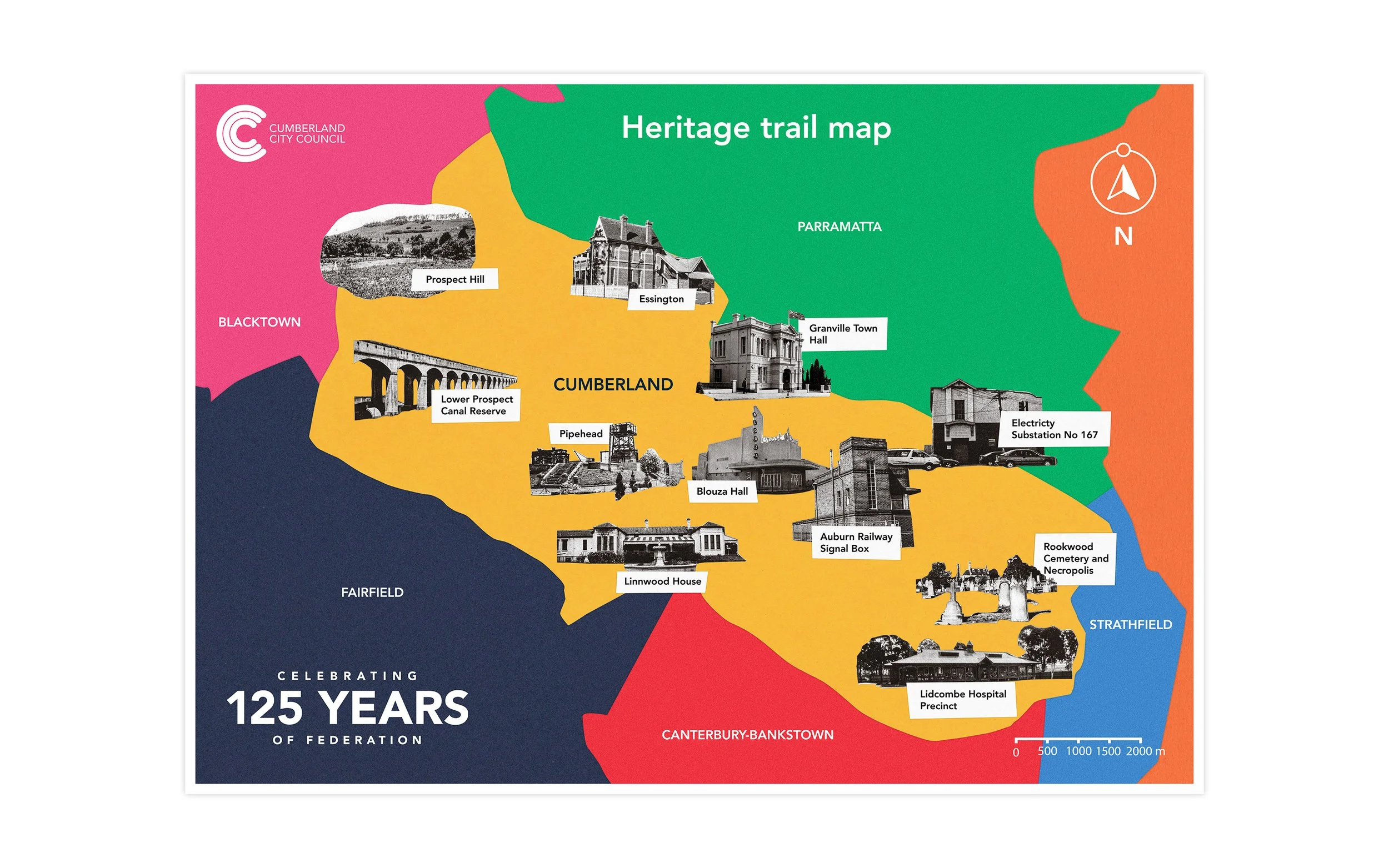 Cumberland City Council engaged Sydney-based collage artist Kubi Vasak to develop the hero illustration and heritage trail map as a single, cohesive visual system for the 125 Years of Federation program. Working within Council brand guidelines, the strategy layered local landmarks, symbols, and narratives to express unity through accumulation rather than a singular story.