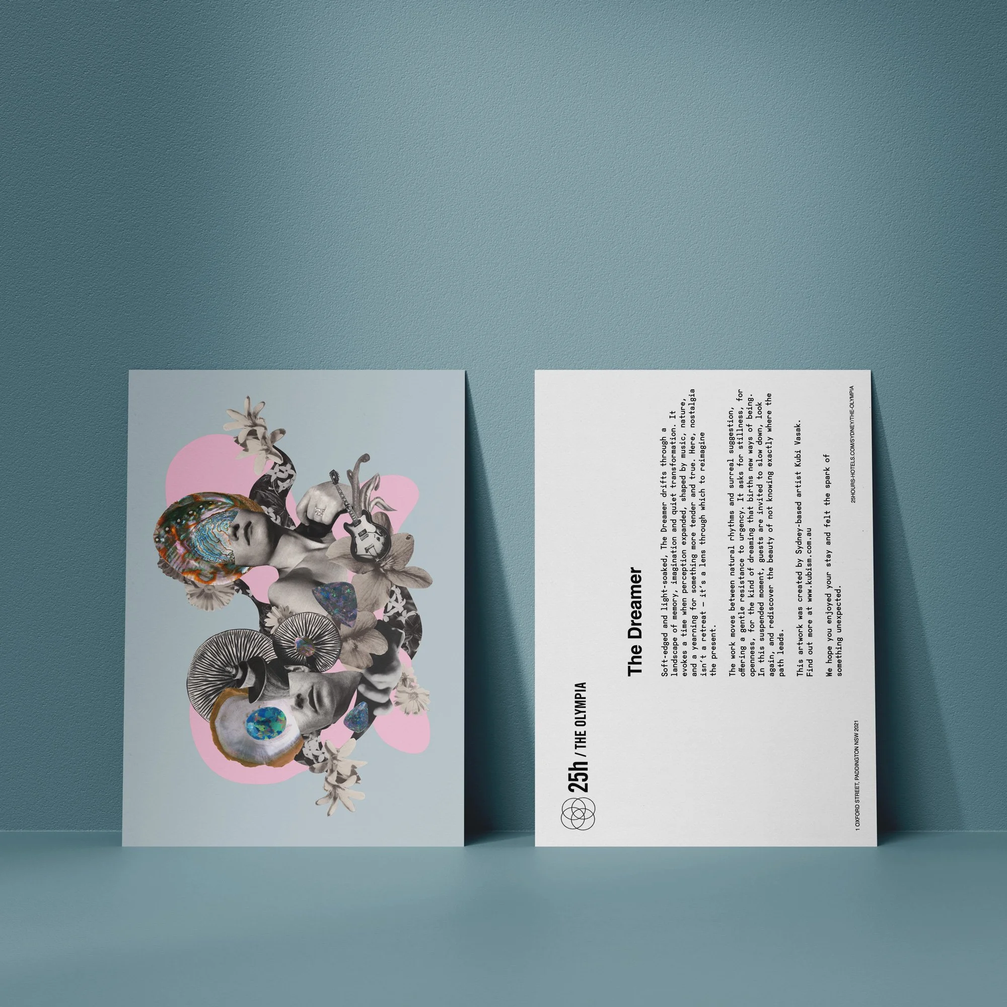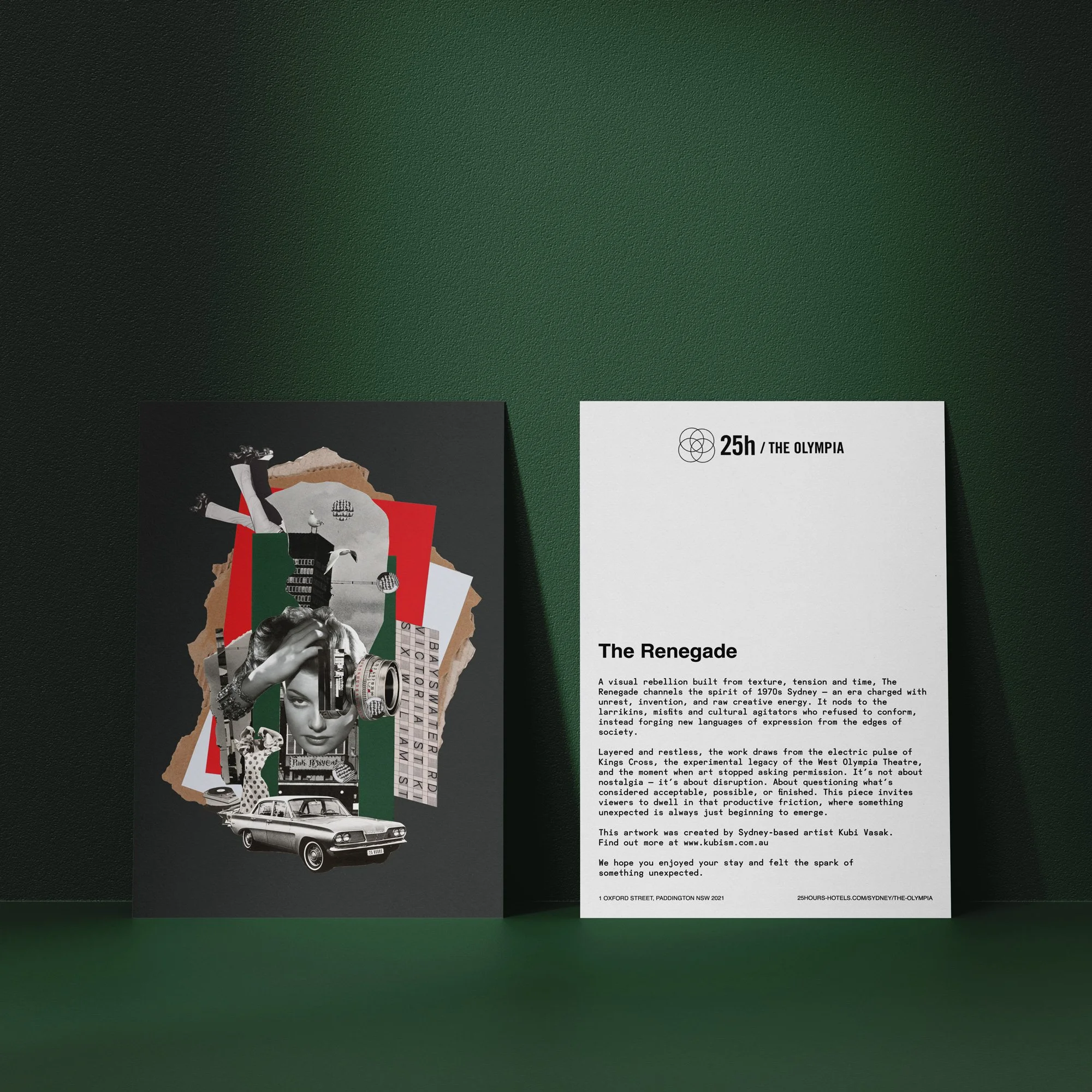 To realise the room-based artworks, 25Hours Hotel Sydney approached Sydney-based collage artist Kubi Vasak to develop four site-specific works responding to the building’s Art House heritage and the cultural energy of 1960s-70s Sydney. The artworks were developed in close collaboration with Shelley Indyk of Indyk Architects, ensuring the collage works and interior design evolved in dialogue with one another.