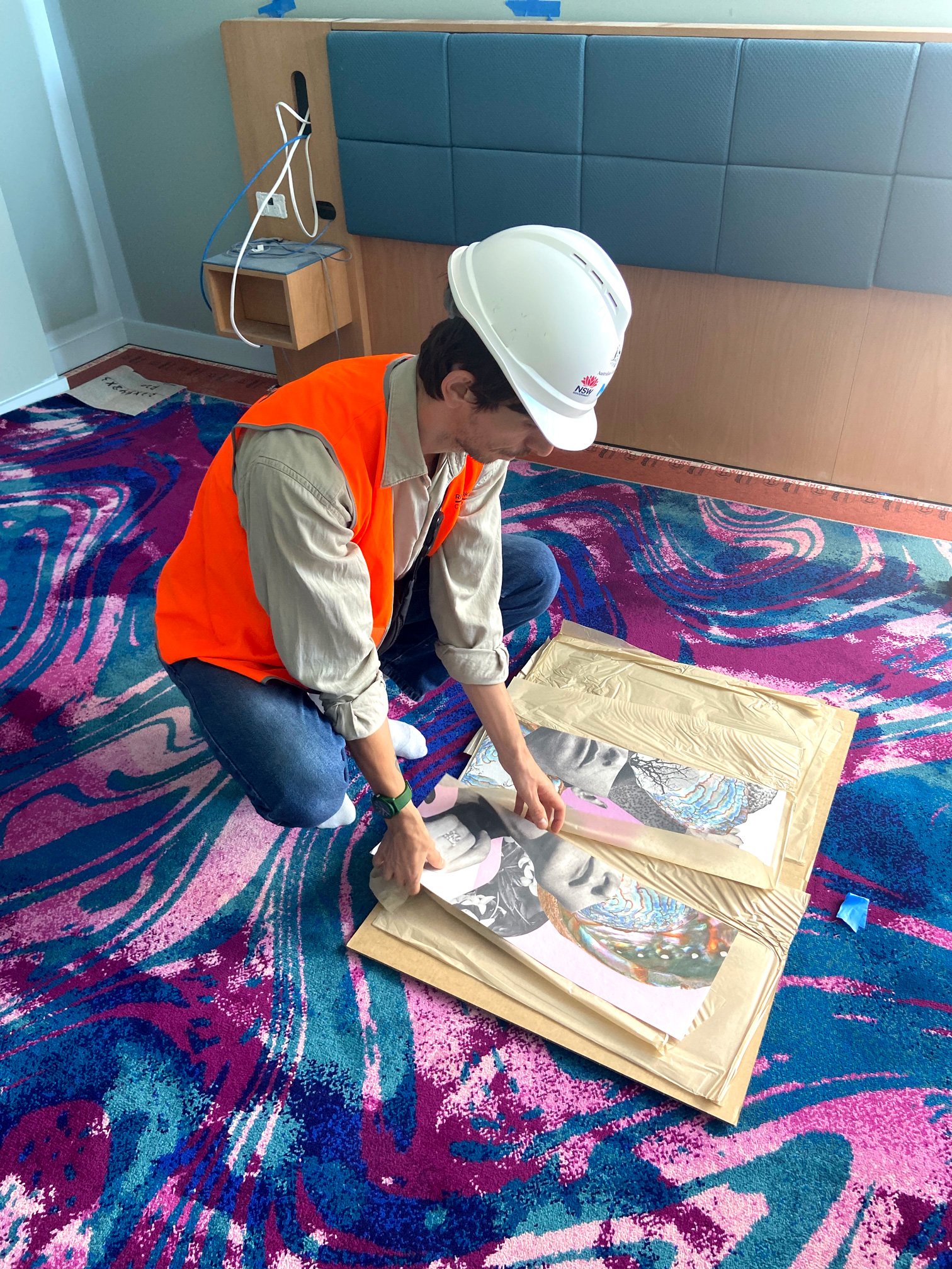 Artist Kubi Vasak testing colour prints on site.