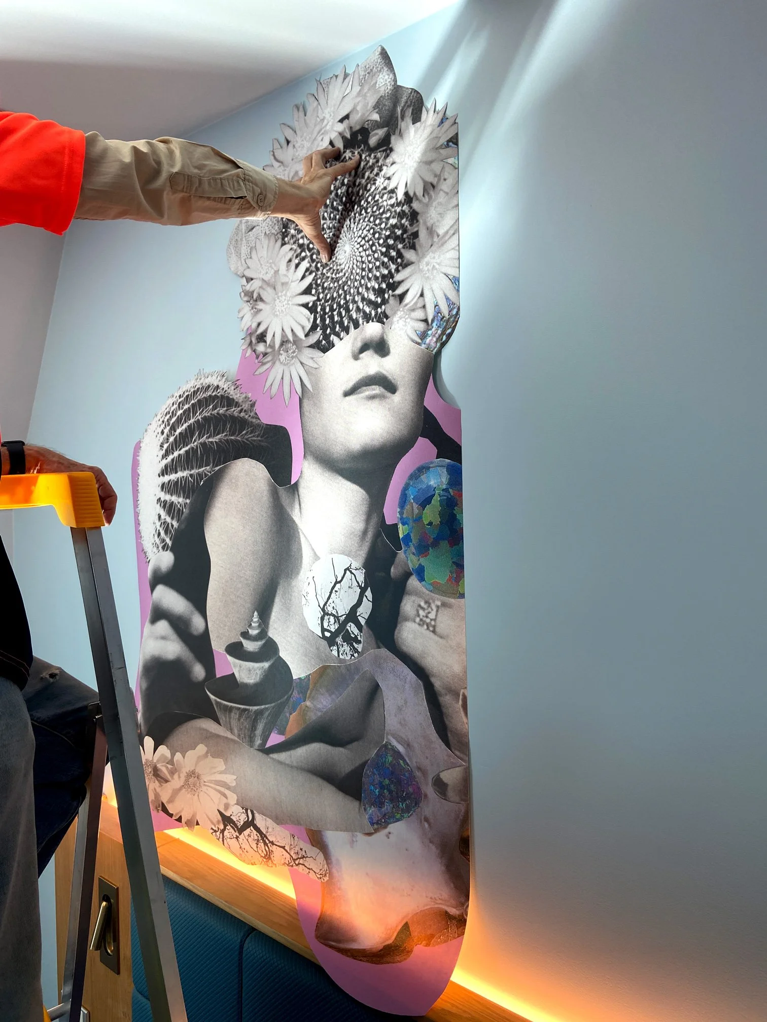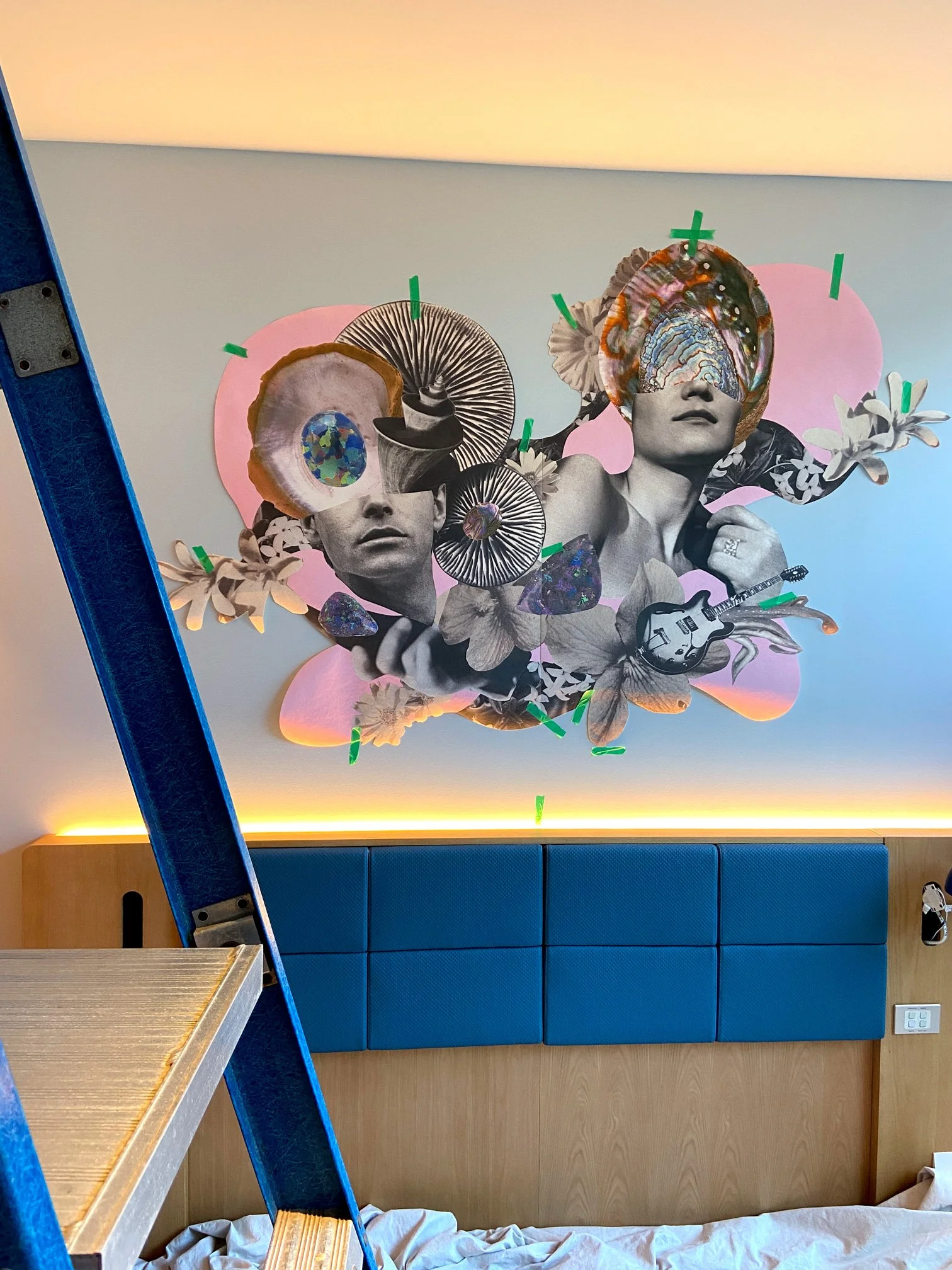 The collages were developed as integrated, room-specific artworks designed to be experienced over time. Installed within guest rooms, the works respond to changing light conditions from day to night, encouraging repeat engagement rather than immediate resolution.