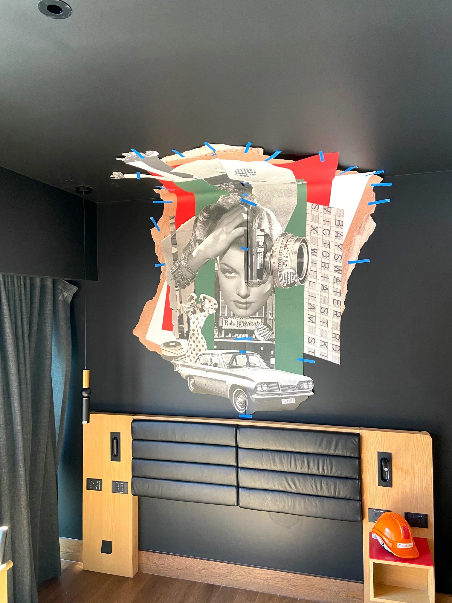 To realise the site-specific application, Kubi Vasak collaborated with Sydney-based printer Mr Wallpaper, working closely to translate the collages into a format that suited the architecture and material conditions of the rooms. This process allowed the works’ tactile qualities — edges, layering, and tonal variation — to be preserved and amplified at scale, reinforcing the vintage and hand-assembled nature of the original collages.